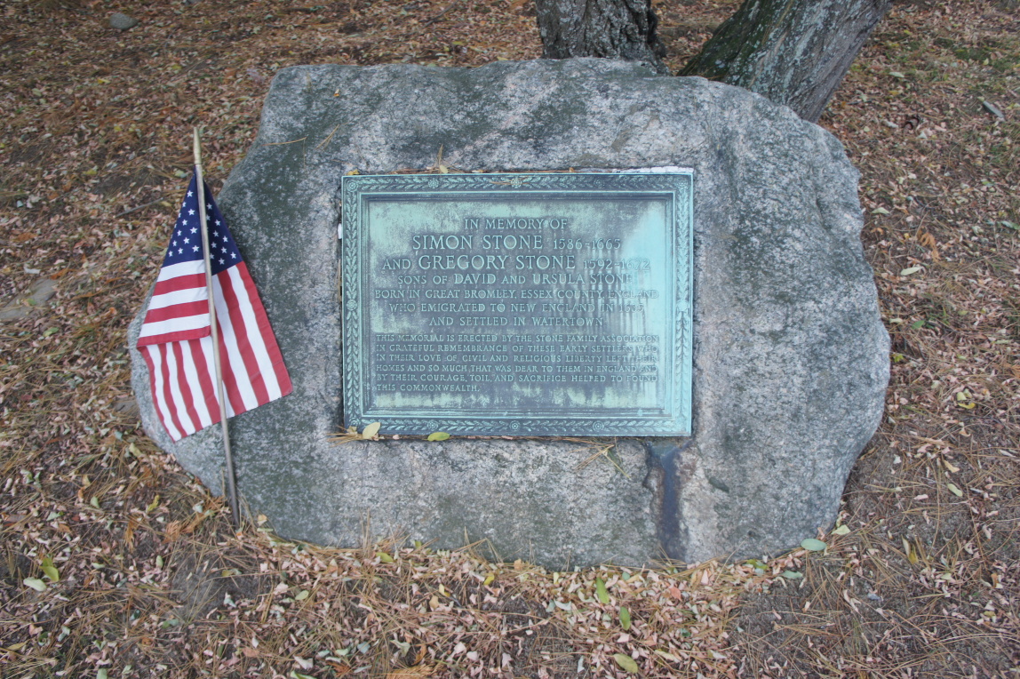 GREGORY STONE came with his family to Watertown in 1635. He had four children with his first wife, Margaret Garrad, three children with his second wife, LYDIA, and another two children she had with her first husband. The youngest child, SARAH, was only two years old when they arrived. GREGORY's brother Simon Stone also came to Watertown that year; Simon owned 50 acres of land in what is now Mt. Auburn cemetery, and lived in Watertown all of his life. GREGORY bought the 16 acre homelot of Thurston Rayner, adjacent to JAMES CUTLER's home, situated south of what is now Washington St. between School St. and Oakley Rd. including the current Chenery Middle School. This land is now in Belmont, less than 1/4 mile from my home. In the next three years he was granted 40 acres in the First Division, 10 acres in the Beaverbrook Plowlands, 10 acres in the Remote Meadow, 2 acres in Rock Meadow, and 3 acres of upland near Fresh Pond. GREGORY became a freeman in Watertown on May 25, 1636. His stay was short-lived, though: in 1637 he sold all of his Watertown land to Thomas Boylston and moved to Cambridge. The rest of his story will be told in the Cambridge chapter.