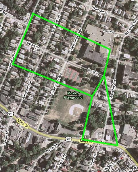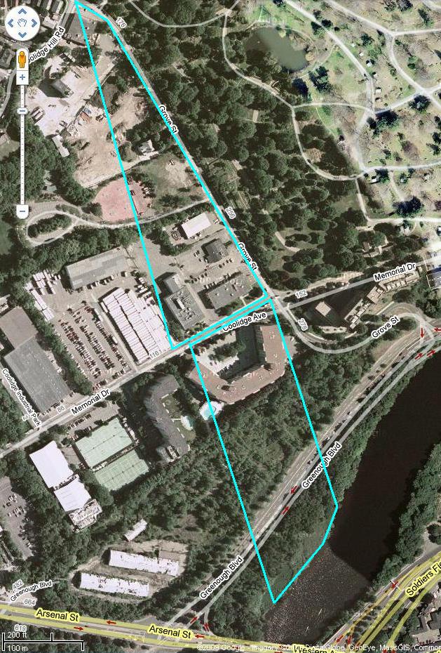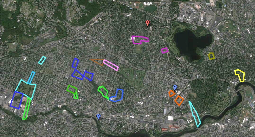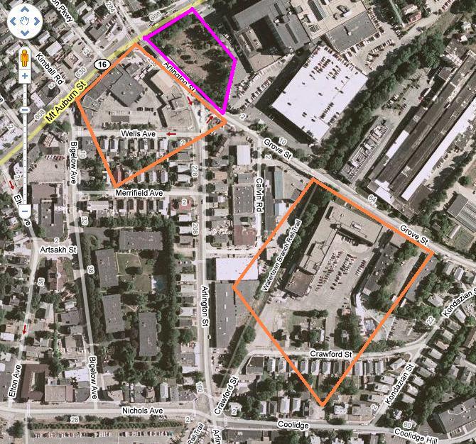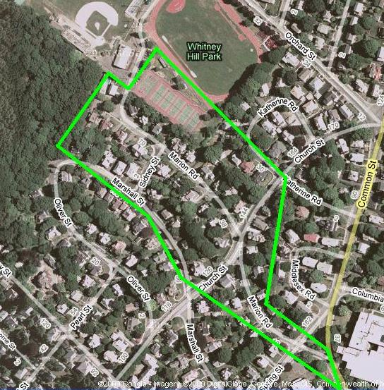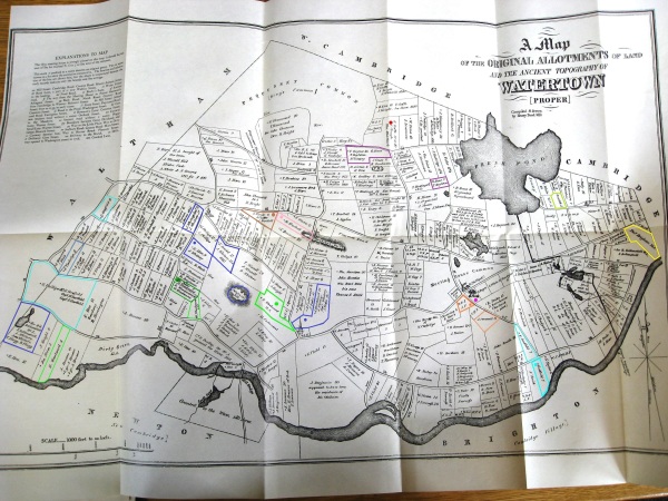 Old property map of Watertown. Dots indicate which properties had their homes. Woodward property in green Red dot is my home: 22 Locust St, Belmont. Garfield property in light blue Purple dot is the Burying Ground. Whitney property in dark blue Hagar property in medium blue ["J.Coolidge" on map] Prescott property in orange Brigham property in yellow Stone property in purple Randall property in brown Holden property in light brown Kemball property in pink Sawtell property in light green Cutler property in light orangeClick on the map or any of the aerial photos below to enlarge it.