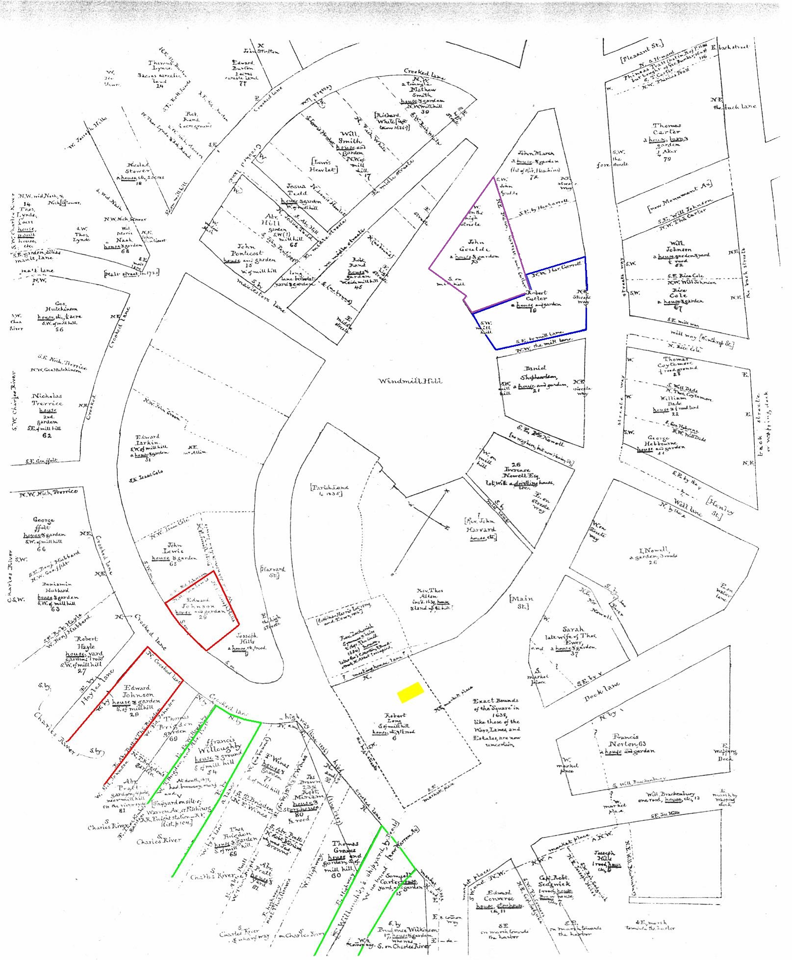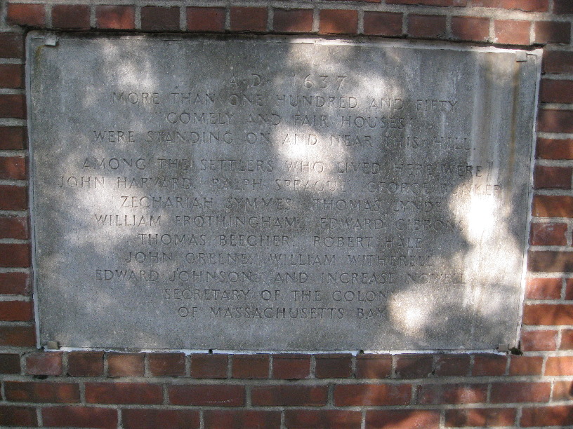 Next to arrive in Charlestown was the Hobart family; at least seven of our ancestors in the extended family lived in Charlestown briefly. EDMUND & MARGARET HOBART and serveral of his married children first came to Charlestown in 1633. EDMUND built 3 adjacent houses for his family, became a freeman on March 4, 1634, and was Constable the same year. MARGARET died, and EDMUND married the widow Mrs. SARAH LYFORD on Oct 10, 1634, with her daughter RUTH LYFORD. In 1635, his son REV PETER HOBART and his wife ELIZABETH and daughter ELIZABETH came and spent the summer living in one of the three houses. He also joined the church and became a freeman in Charlestown. By Sept. of 1635 all of the Hobart's had moved to Hingham and had no more dealings with Charlestown. Much more about the Hobart and Lyford families is in the Hingham chapter.