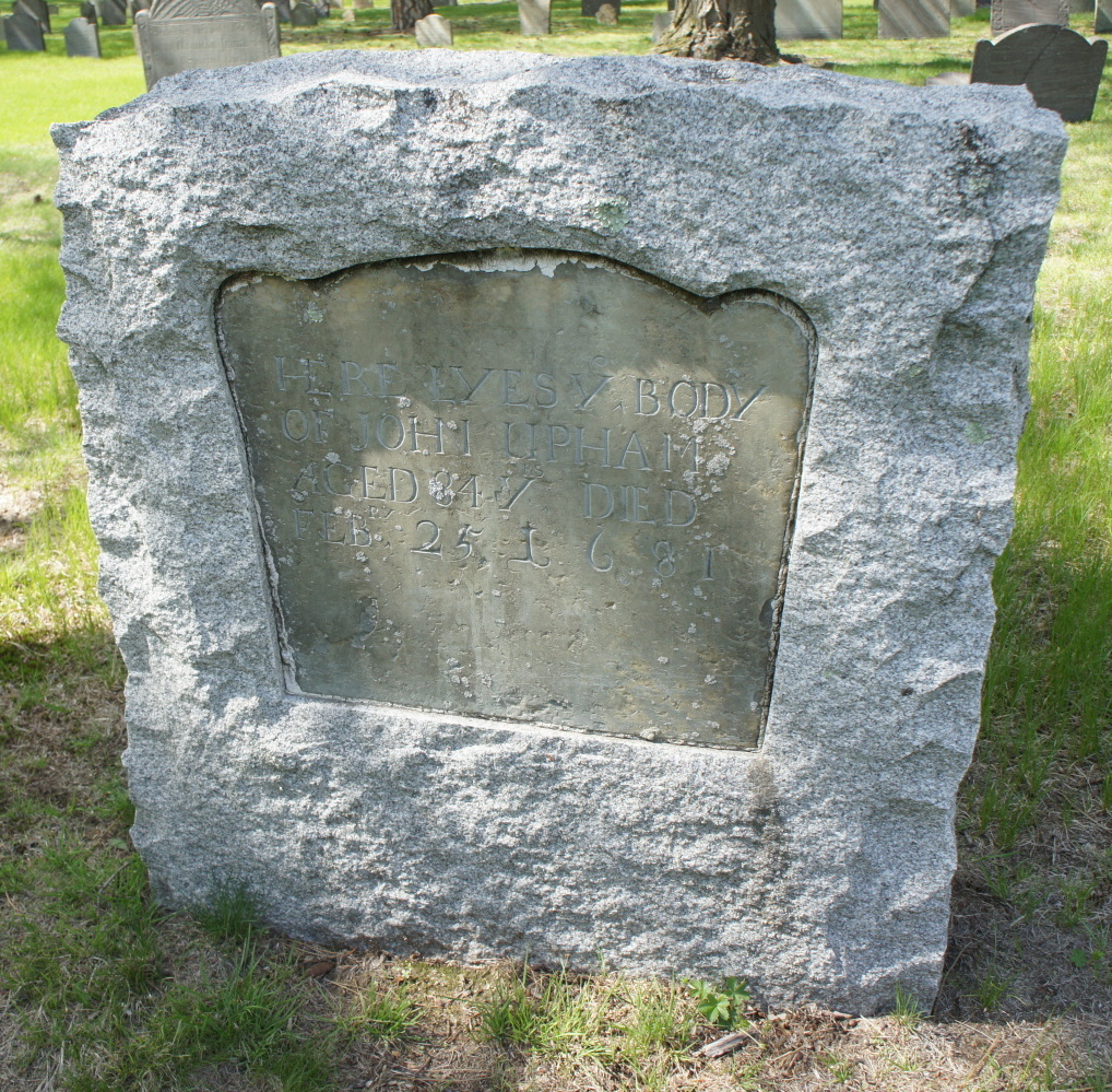The Upham's originally lived in Weymouth (see the Hingham chapter). They arrived in Weymouth in May of 1635 along with their three children including ELIZABETH, born in 1632. After living there 13 years, they moved to Malden, where JOHN was elected selectman from 1651 through 1660, and town moderator for three years. He also became a deacon of the Malden church on June 25, 1658. Daughter ELIZABETH married THOMAS WELCH in 1653 and lived in Charlestown the rest of her life. Wife ELIZABETH died in 1671, and JOHN soon remarried Katharine (Richards) Hollard. The Hollard family had come to America on the same ship as the UPHAM family. He died in 1681, and is buried in the Old Burial Ground (Bell Rock Cemetery) in Malden.
